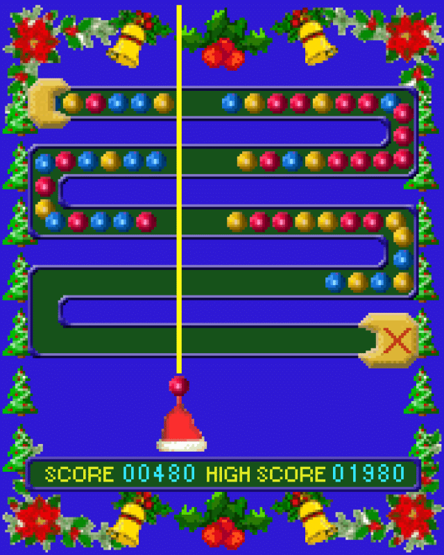 This is a Ball Game. Match 3 same color balls or more. X Ball can match to any color. For any ball you hit you will get 10 points. Hit the X Ball and you will get a bonus gift.Grab any bonus gift with Santa's Hat.Bonus gifts can be: Slow Motion, Guidance Beam, Laser Beam, or Bomb. Every 10000 points The Ball's Path will change. Don't let the ball enter the X Zone.